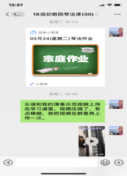 2、利用学习通、钉钉、班级小管家等平台对基础钢琴生及初教院学生进行在线教学及回课检查。